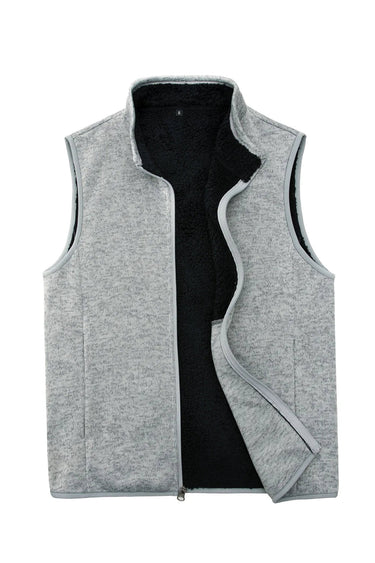 This men's full-zip sweater fleece vest features a stand-up collar and a full zipper closure for reliable protection against the elements. Its comfortable knitted fabric shell is paired with a soft sherpa lining, delivering both excellent breathability and superior warmth during the cold winter months.