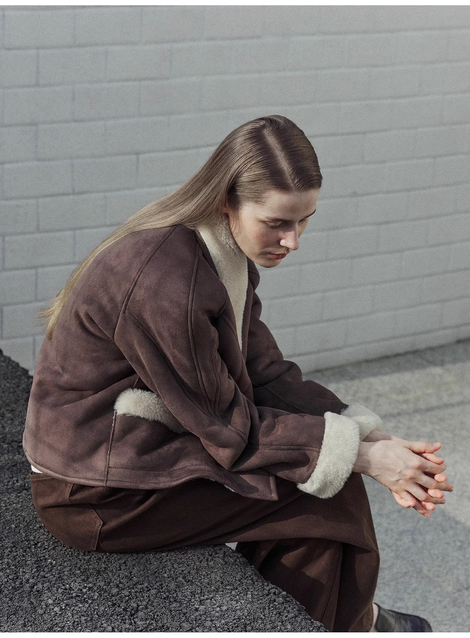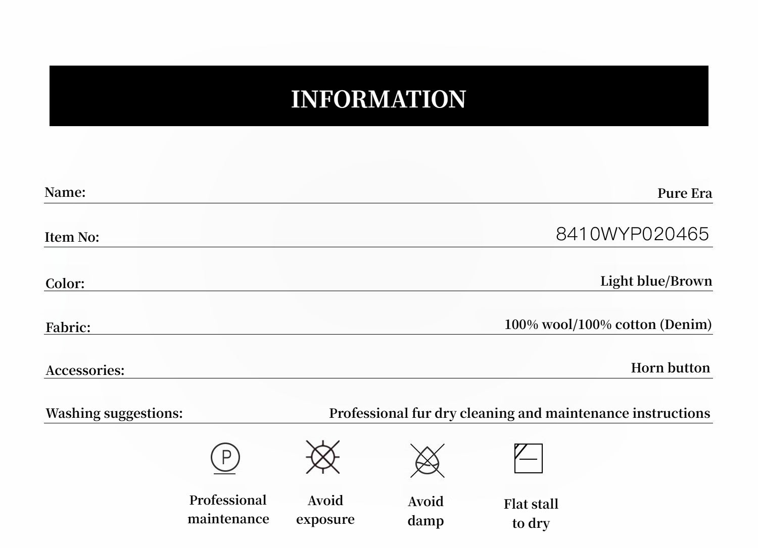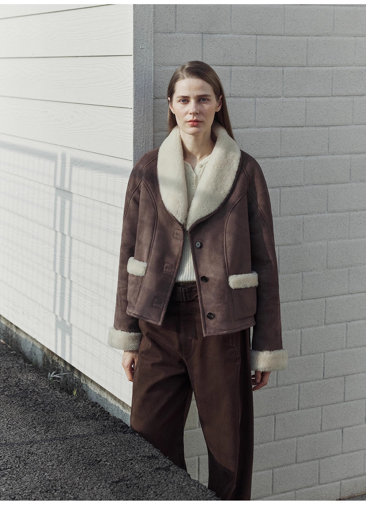 Exclusively customized washed cotton denim blue fabric, with contrast color curly wool lining, warm and stylish, pretty and casual, delicate velvet texture, retro suede material with shawl wool lining, dense, soft, warm and delicate, excellent cold-proof effect, contrast color wool shawl collar, retro and fashionable, straight body, short and slim, tall.
