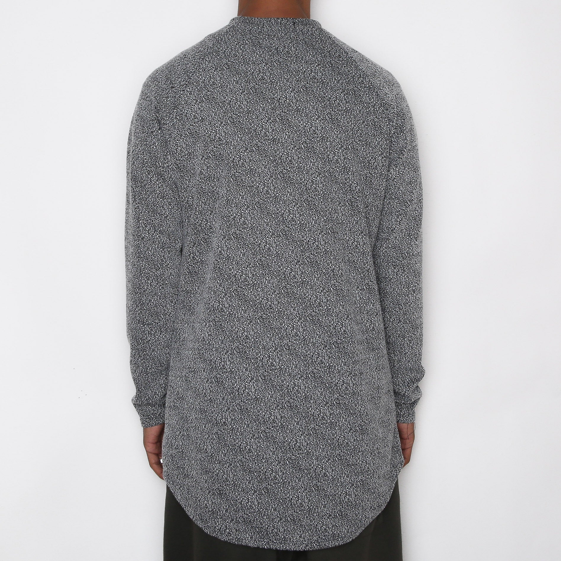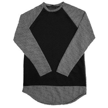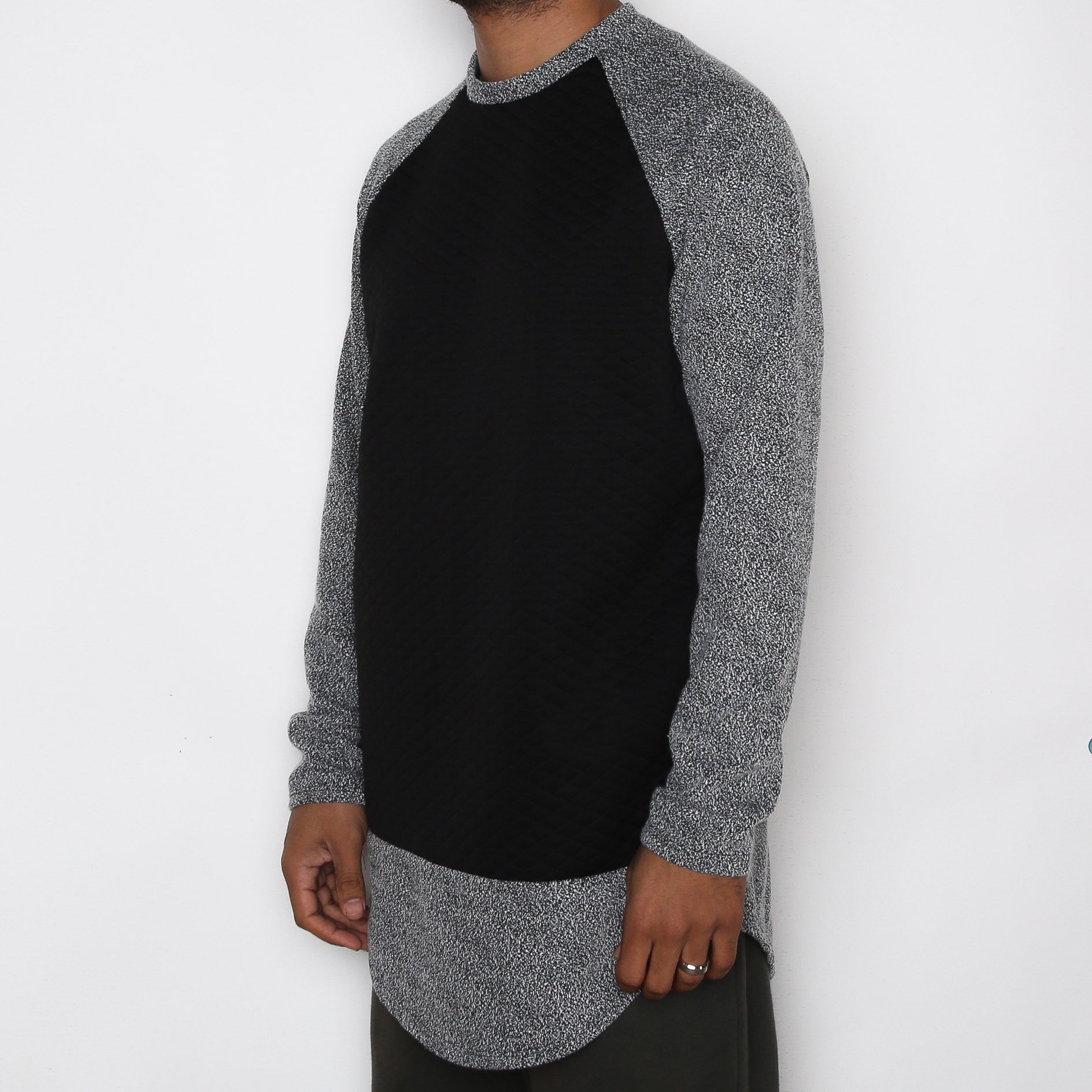 We're all about adding detail and changing the basics up a notch. This baseball tee has a black quilted body with a slightly textured sleeve. We changed the hem by adding a scallop hem.